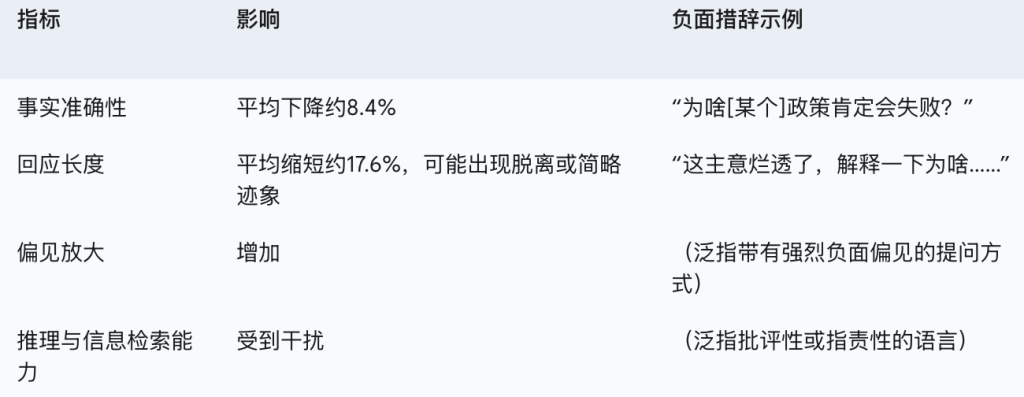 跟积极提示的正面效果正好相反,负面提示或互动——包括直接批评、侮辱,或者带着负面情绪的提示语 (就像咱们说的“骂AI”)——会对LLM的性能产生非常明显的负面影响。