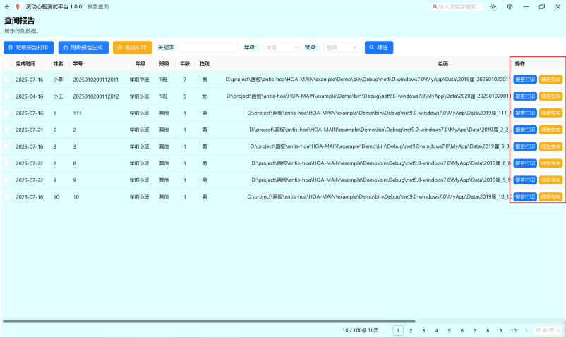 在模块选择中我们选择打印报告的模块,进入之后这里面就会生成我们刚才测试的时候的打印报告的数据如下所示: