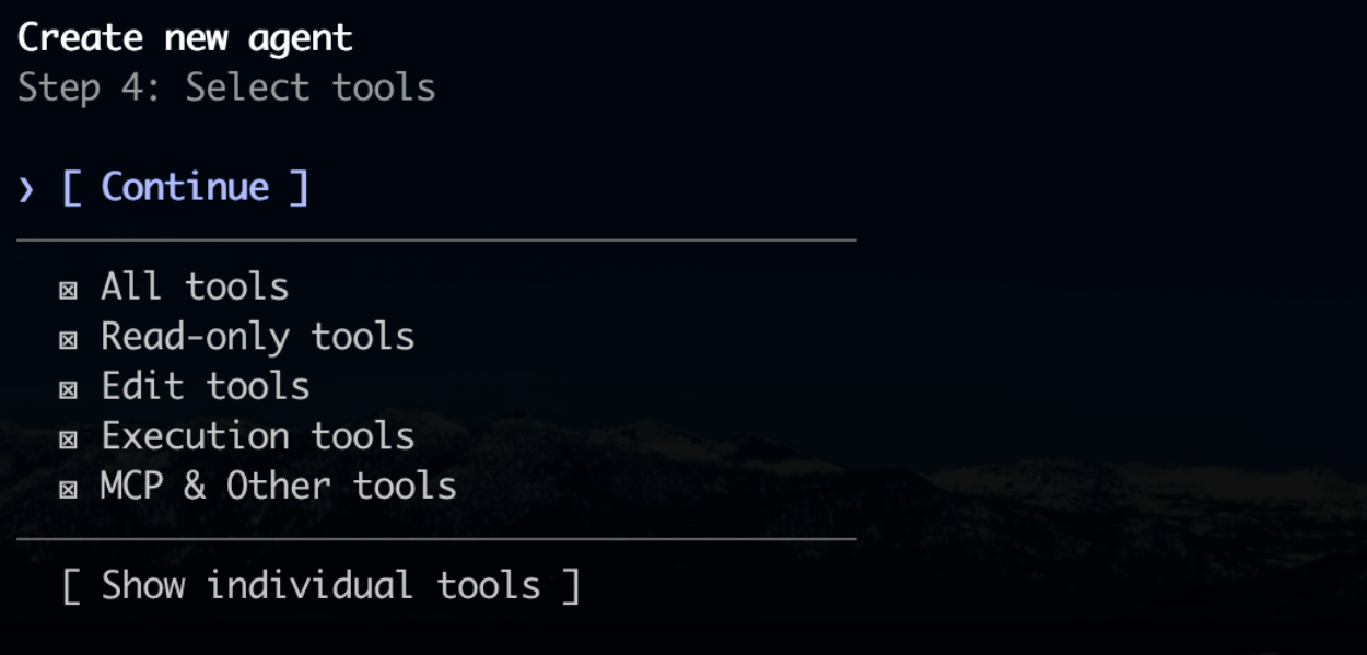 2. 授予专属工具:你可以为这个代理精确授权它能使用的工具(如文件读写、命令行工具等)。如果留空,它将继承你的所有可用工具。这实现了权限的最小化管理,增强了安全性。