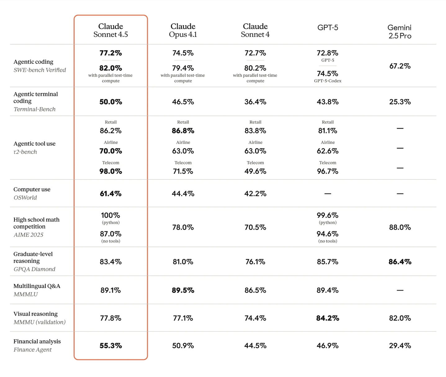 总结一句话:Claude sonnet 4.5 在编程、自动化、电脑操作、理工科、金融等等领域全部相对于Opus 4.1都有明显提高。