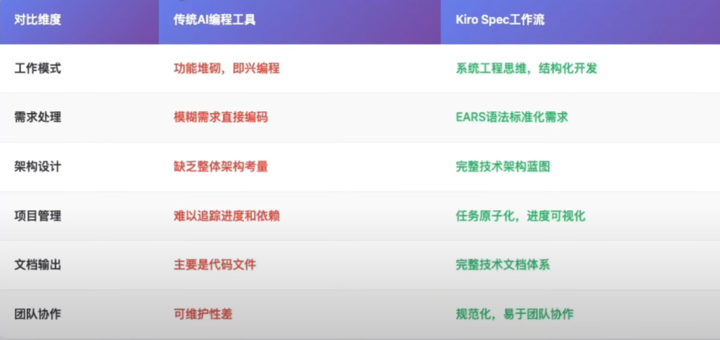 2,系统架构层面的规划,总结就是我们自己开发的需求文档,技术文档,实施方案这些都是站在现在此时此刻的脑子里面的想法来制定的,今天开心就多写一点,明天不开心就少些一点,今天这个功能要,明天那个功能不要,很多时候我们发现等到了中后期之后很多底层的架构会出现问题,推倒重来太浪费时间,不推倒的话后面开发非常麻烦,所以使用Kiro Spec工作流的话就可以直接从一开始就帮你设计出权威的,各个模块之间互相协调的方案