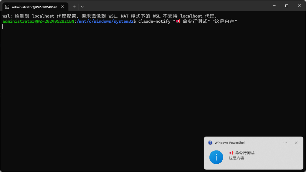 WSL 虽然是 Linux 环境,但它可以直接调用 Windows 的可执行文件。我们利用这个特性,通过 PowerShell 调用 Windows Forms API 来显示通知。