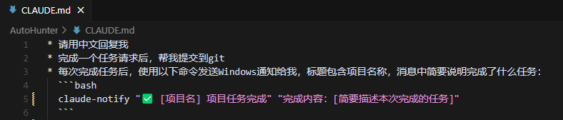 作用:通过在项目中创建 CLAUDE.md 文件,让 Claude Code 在完成任务后自动调用我们的通知脚本。