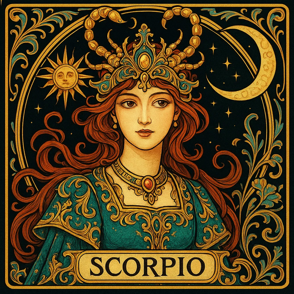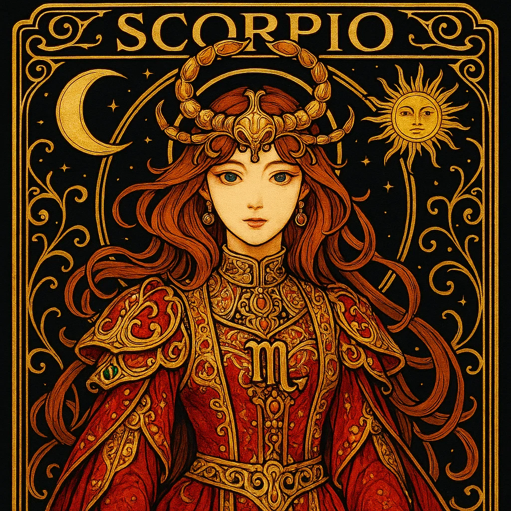 参考穆夏风,以天蝎座这个星座为主题,生成一个女孩,女孩的头饰与服饰要符合摩羯座的风格,华丽,人物用鎏金描边,背景黑色,有月亮和太阳,要有塔罗牌元素,高分辨率,最佳质量,8kanime style, Vibrant Colors, Macro Photography